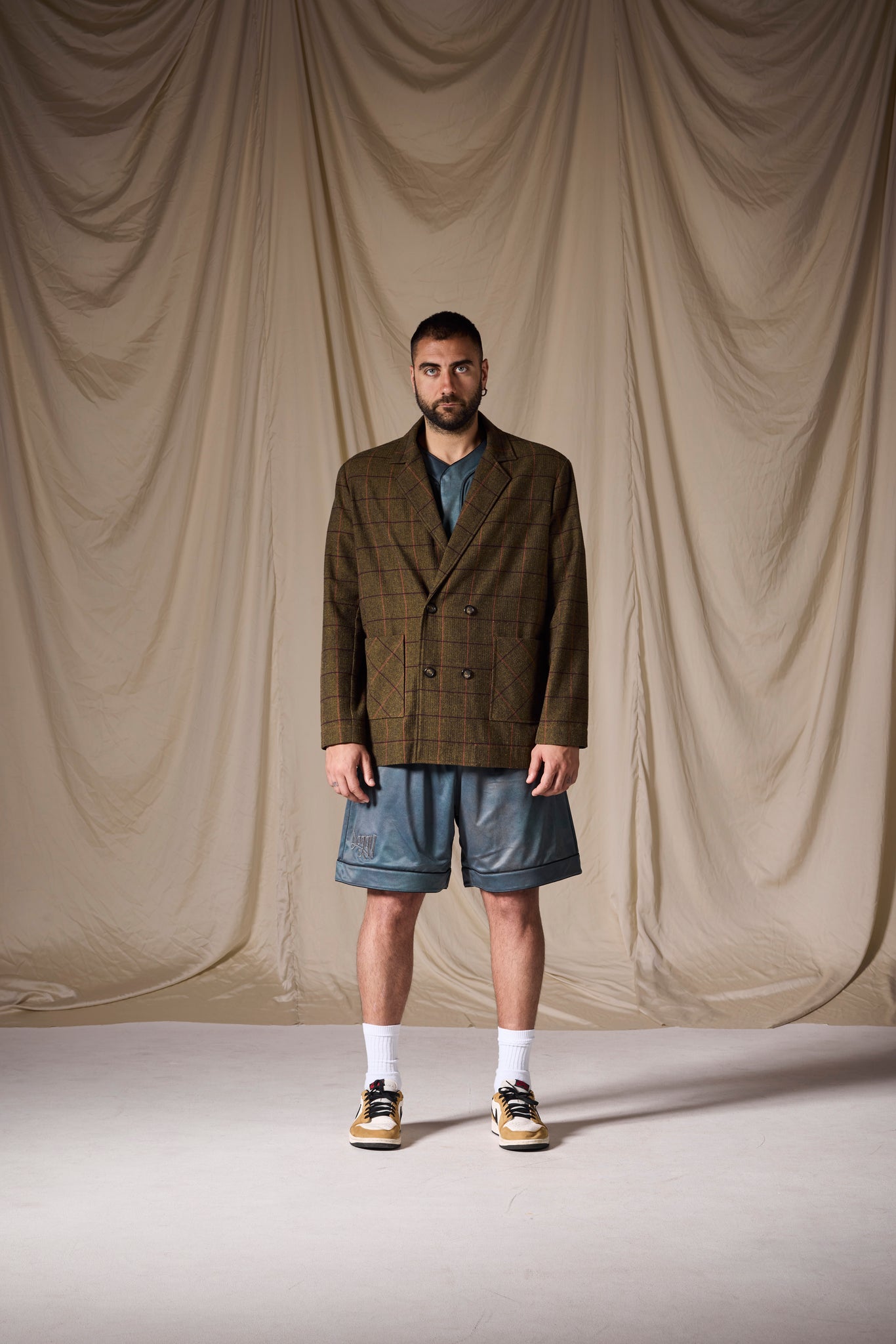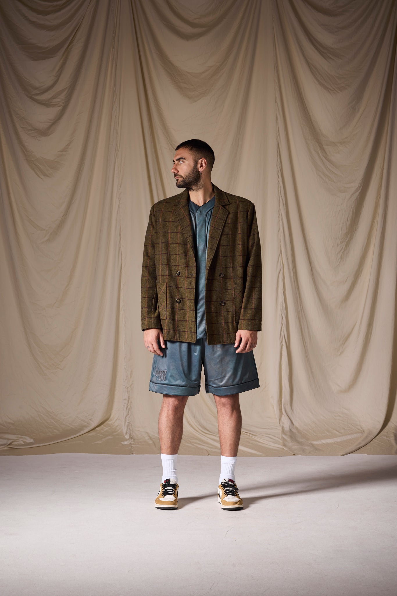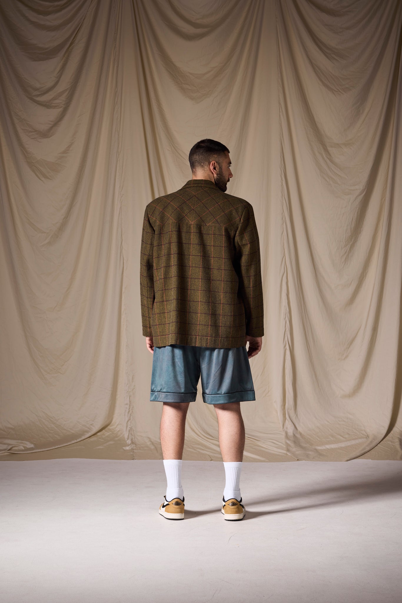 La giacca ha un fit over con linea dritta, spalla leggermente scesa e volumi ampi.